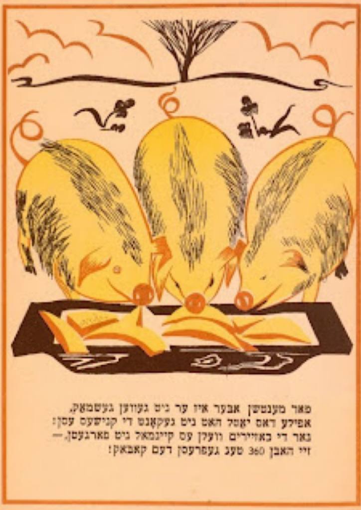 Замечательный поэт Лейб Квитко тоже присоединил свой голос к кампании. Его поэма «Хазерлех» (Поросята), написанная в 1935 году, вышла в Одессе и разошлась огромными тиражами для того времени по-русски, по-украински, по-немецки и, разумеется, на идише. Разумеется, в свиноводстве видели не только и не столько экономический аспект, но и идеологическое достижение социальной инженерии.
